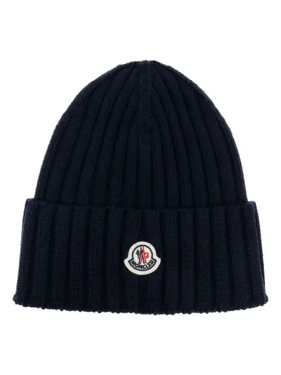 midnight blue virgin wool knitted construction ribbed knit logo patch to the front turn-up brim