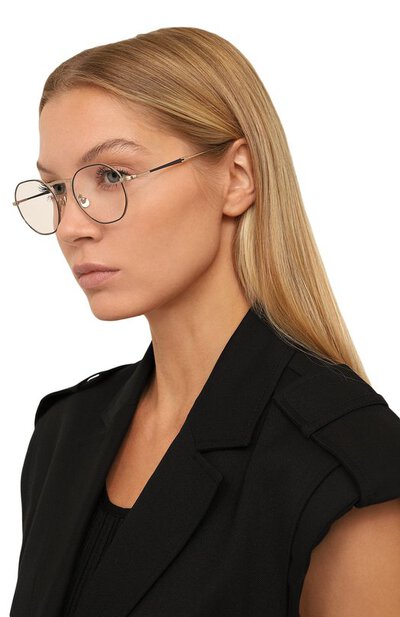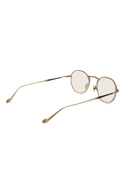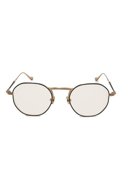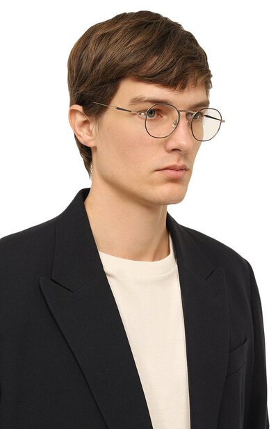 Мастера марки вручную изготовили тонкую оправу из легкого ультрапрочного титана, который не деформируется со временем. Покрытие оттенка античного золота и замысловатый выгравированный узор придают модели сходство с винтажными аксессуарами. Круглую форму рамок подчеркнули узким глянцевым кантом темно-синего цвета.