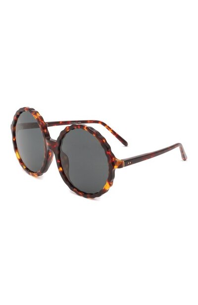 В крупных круглых очках черепаховой расцветки читается увлечение 1970-ми. Для изготовления аксессуара с волнистыми ободами, добавляющими образу романтичный флер, использовали полупрозрачный прочный ацетат, отполированный до глянцевого блеска. Материал очень легкий, поэтому модель с зелеными линзами, полностью блокирующими ультрафиолет, почти не ощущается на лице.