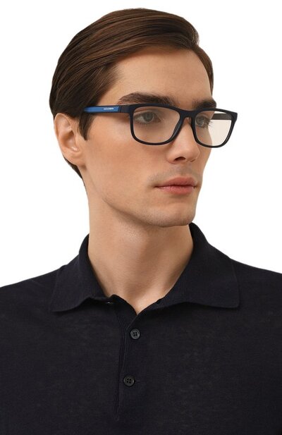 Тонкую прямоугольную оправу мастера марки выполнили из прочного легкого пластика, который остается теплым на ощупь и в холодную, и в жаркую погоду. Узкие дужки декорировали ярко-синими вставками с миниатюрным белым логотипом, деликатно указывающим на принадлежность аксессуара бренду.
