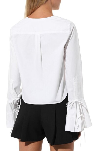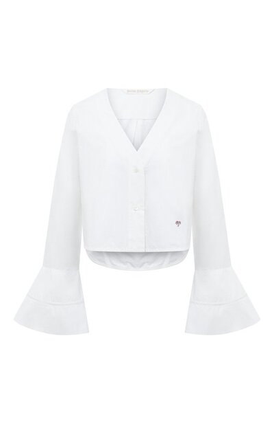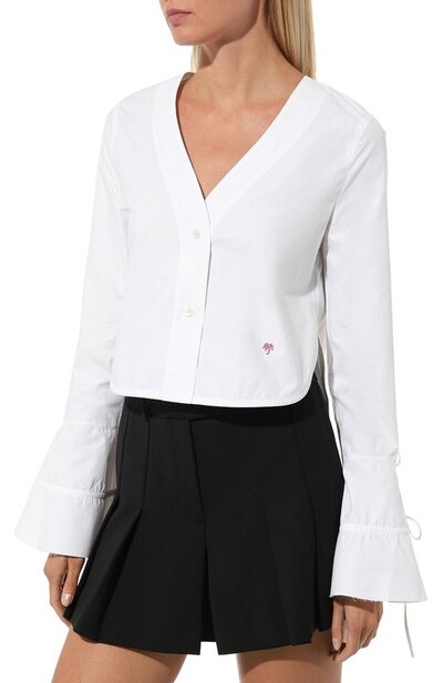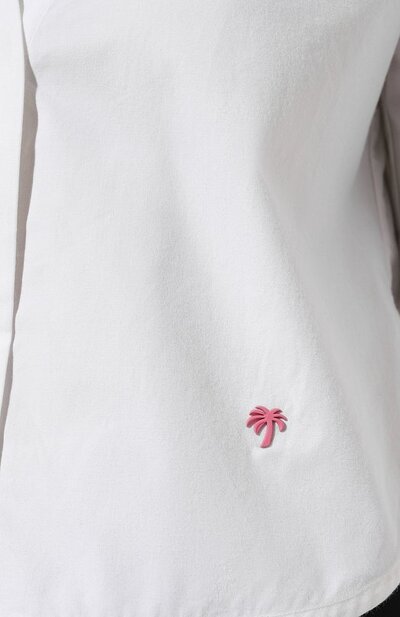 За основу белоснежной блузы Франческо Рагацци взял классическую рубашку. При этом дизайнер кардинально изменил ее, укоротив крой, заменив отложной воротник глубоким V-образным вырезом и дополнив рукава расклешенными манжетами, подчеркнутыми узкими лентами. Подход к выбору материала остался прежним — модель выполнили из тонкого гладкого хлопка. Спереди изделие украсили миниатюрной розовой накладкой в виде пальмы.