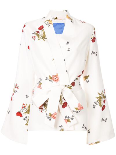 Ivory silk Cognac robe coat from MacGraw featuring a tie waist, long sleeves, a tie waist, an all-over floral print and flared cuffs.