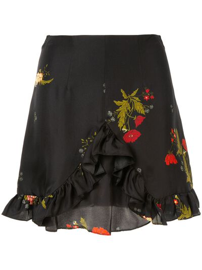 Black silk Bonjour skirt from MacGraw featuring a fitted waist, a frill trim, a floral pattern, a short length and a slim fit.
