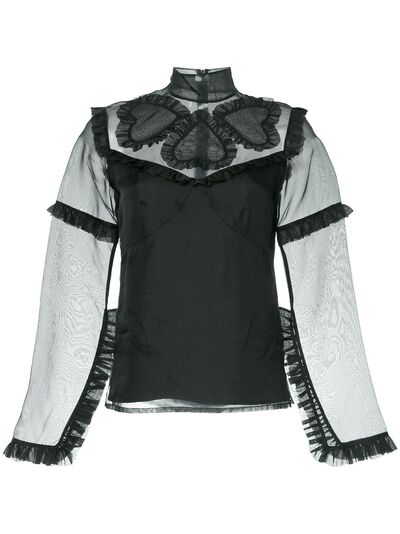 Black silk Queen of Hearts organza top from MacGraw featuring long sleeves, a ruffle trimming, a loose fit and a heart motif.