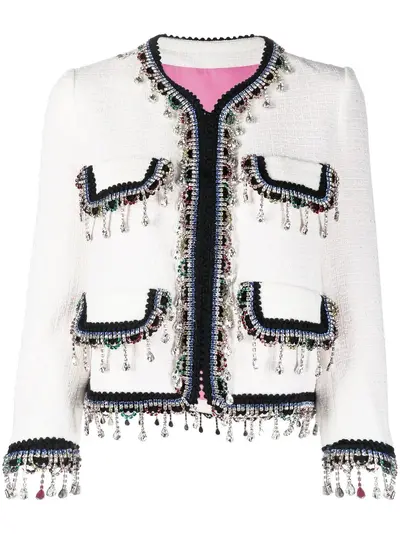 white V-neck front flap pockets crystal embellishment three-quarter length sleeves cropped