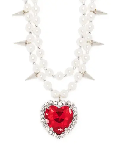 white/red glass crystal heart pendant faux-pearl chain spiked stud design silver-tone hardware lobster claw fastening adjustable-length chain