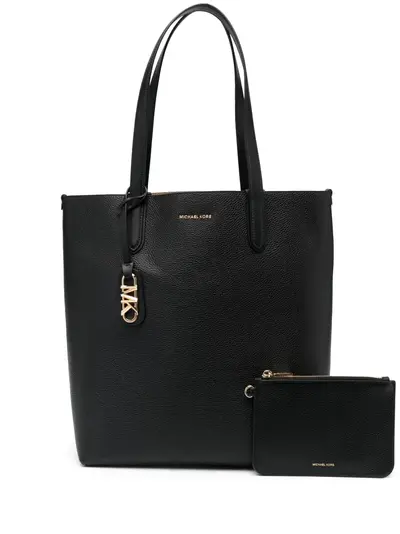 black calf leather grained texture reversible gold-tone logo lettering logo tag gold-tone logo plaque open top two long top handles main compartment removable pouch