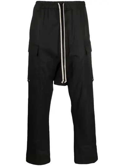 black stretch-cotton elasticated drawstring waistband drop crotch two side cargo pockets two rear flap pockets straight leg