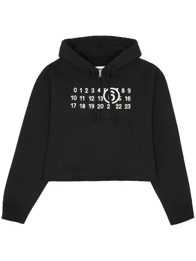 black cotton logo print to the front drawstring hood short front zip fastening long sleeves straight hem