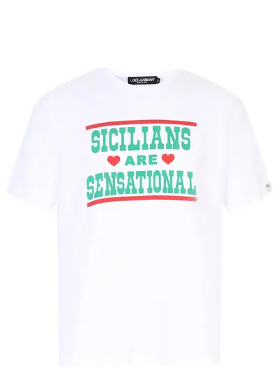 -Белая футболка коллекции Re-Edition из тонкого джерси на основе хлопка от DOLCE&GABBANA. -Модель с надписью Sicilians are sensational в цветах итальянского флага цитирует модель из весенне-летней коллекции 1992 года. -Модель полуприлегающего кроя с короткими рукавами, круглым вырезом горловины и принтом спереди. -На показе Re-Edition вневременные образы из архивов Dolce&Gabbana возвращаются на подиум: в рамках новой «отредактированной» коллекции концепция современности берет начало в прошлом. -Некоторые изделия дополняет лейбл Re-Edition с указанием года создания архивной модели, послужившей источником вдохновения нового дизайна.
