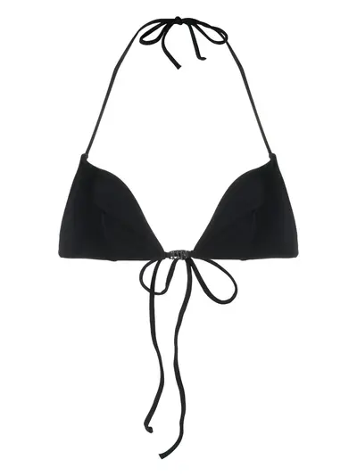 black stretch-design signature Icon motif silver-tone logo lettering triangle cup halterneck tie fastening rear tie fastening sleeveless Be mindful to try on swimwear over your own garments.
