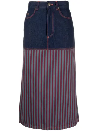 indigo blue/bordeaux red cotton denim panelled design vertical stripe print logo patch to the rear contrast stitching high waist concealed fly and button fastening classic five pockets straight hem unlined mid-calf length Condition: EXCELLENT. This previously owned item is in near-perfect condition with no signs of damage or use.