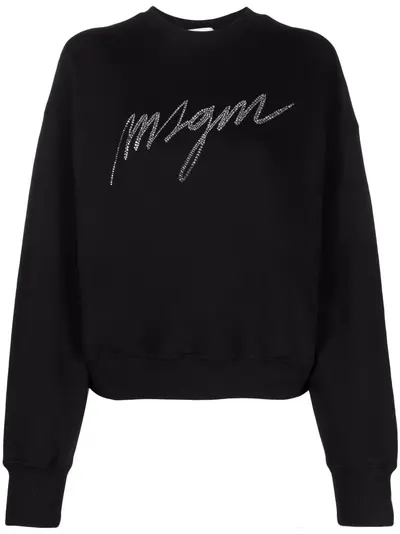 black cotton logo embellishment rhinestone embellishment round neck long sleeves straight hem ribbed cuffs and hem