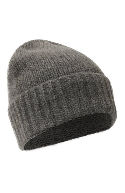 Главное достоинство шапки спокойного серого оттенка нельзя оценить взглядом. Плотно скрученная кашемировая пряжа, созданная из пуха горных коз, почти не ощущается на голове, но окутывает ее теплом. Чтобы аксессуар лучше защищал от ветра, его дополнили широким отворотом.