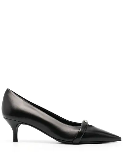 black calf leather gold-tone logo lettering pointed toe branded insole 60mm mid heel