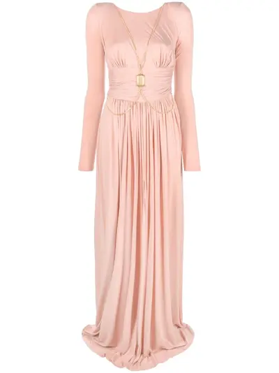 blush pink stretch-design round neck shoulder pads long sleeves ruched detailing gold-tone hardware cable-link chain logo plaque scoop back pleated skirt floor-length