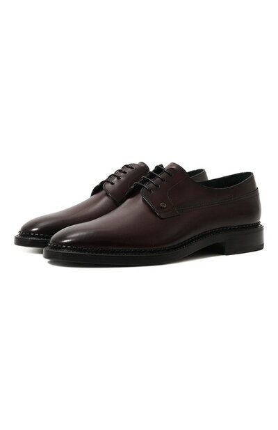 Дерби с миниатюрной фирменной эмблемой возле шнуровки стилизованы под обувь, с которой не расставались несколько лет. Мастера марки, основанной Стефано Риччи, имитировали следы времени многослойной окраской готовых туфель. На гладкую кожу нанесли пигменты разных оттенков бордового так, чтобы получились плавные цветовые переходы, а затем отполировали пару до яркого блеска.