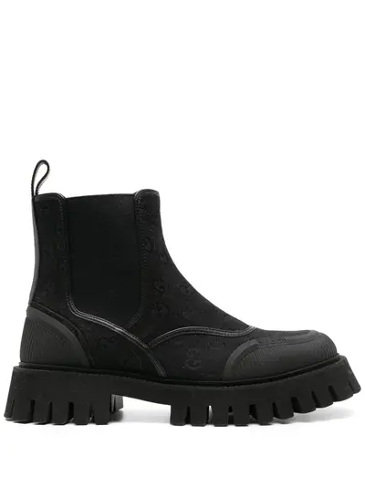 black panelled design classic GG canvas monogram jacquard embossed logo to the side leather trim round toe elasticated side panels pull-tab at the heel branded insole chunky rubber lug sole slip-on style This piece comes complete with a protective dust bag.