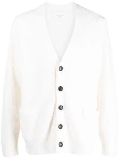 white wool knitted construction V-neck front button fastening long sleeves ribbed cuffs and hem two front patch pockets