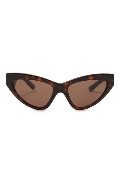 Для производства черепаховой оправы очков в форме cat eye мастера марки использовали легкий прочный ацетат, отполированный до зеркальной гладкости. Широкие фигурные дужки декорировали крупной золотистой монограммой DG, обозначив принадлежность аксессуара бренду. Однотонные коричневые линзы из устойчивого к царапинам нейлона обеспечивают 100% защиты от ультрафиолетовых лучей.