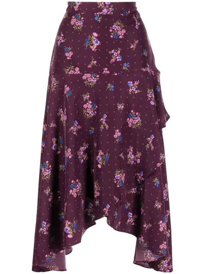 plum purple/multicolour all-over floral print ruffled detailing asymmetric design high waist rear elasticated waistband asymmetric hem mid-calf length