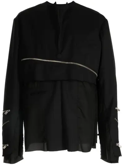 black wool blend panelled design zip detail raw-cut edge crew neck long sleeves straight hem