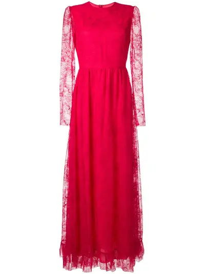 Red lace detail evening dress from Philosophy Di Lorenzo Serafini featuring a long length, a round neck, long sleeves, a floral lace pattern and a back zip fastening.