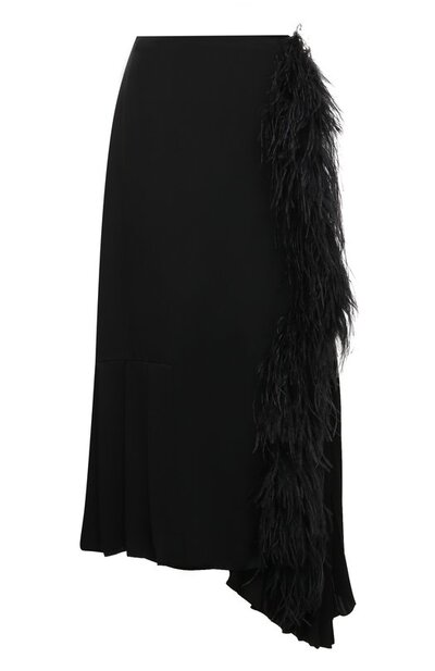 Черный базовый цвет этой миди-юбки Миучча Прада и Раф Симонс компенсировали асимметричным кроем. Его подчеркнули, украсив модель как отделкой из длинных перьев страуса, так и вставками с крупными складками. Изделие выполнили из шелковистого тонкого материала. Посадку на талии можно регулировать широким текстильным поясом с золотистой пряжкой фастекс.
