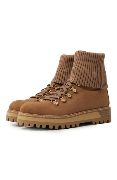 Маскулинность силуэта бежевых ботинок St. Moritz с протекторной подошвой, как у трекинговой обуви, Энио Силла смягчил заклепками с прозрачными кристаллами, которыми подчеркнул шнуровку. Для пошива пары дизайнер выбрал бархатистую плотную замшу. На контрасте с ее фактурой играет мягкий эластичный трикотаж, из которого выполнили вставку, напоминающую носок в тон.