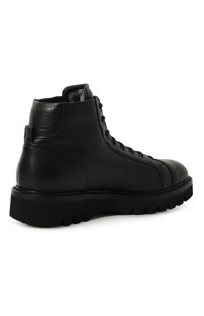 В черных высоких ботинках будет комфортно во время долгих прогулок в морозную погоду. Модель из зернистой кожи утеплили густой овчиной, которая идеально удерживает тепло и не дает ногам вспотеть в помещении. Глубокий протектор на широкой массивной подошве создает плотное сцепление с заснеженной дорогой. Пару дополнили короткой молнией сбоку, поэтому ее удобно надевать и снимать, не расшнуровывая.