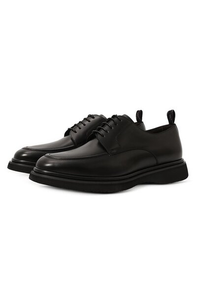 Для изготовления черных дерби с объемным швом, как у лоферов, команда марки, основанной Джоном Ричардсоном Барреттом, использовала мягкую гладкую кожу. Чтобы материал приобрел деликатный блеск, его тщательно отшлифовали мягкими щетками вручную. Пару на сплошной упругой подошве дополнили разноцветной текстильной петлей на заднике.