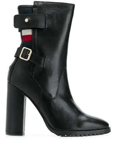 Black leather tricolour-stripe buckled boots from Tommy Hilfiger featuring a side zip fastening, a push-pin side strap, a buckle-fastened side strap, a red, white and blue cotton stripe panel, a round toe, a high block heel and a rubber sole.