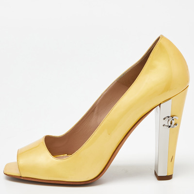 Chanel Yellow Patent Leather CC Open Toe Pumps Size 38 862775 (жёлтый, lpn23893852)