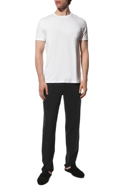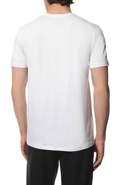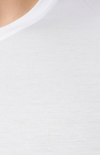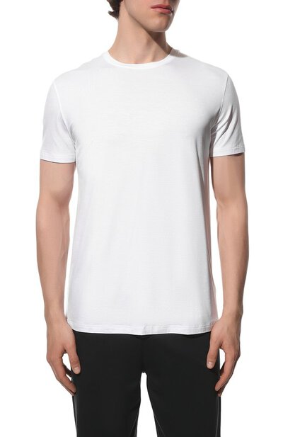 Белоснежная футболка с короткими рукавами получилась особенно комфортной за счет материала. Для изготовления модели использовали тонкое эластичное джерси из шелковистого микромодала с добавлением стрейчевых волокон. Этот трикотаж из целлюлозы натуральной буковой древесины исключительно приятно ощущается на теле, пропускает воздух лучше хлопка и поддерживает оптимальную температуру.