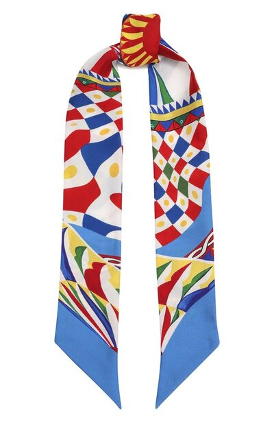 Знаковый узор Carretto с расцветкой, напоминающей экспериментальное искусство 1960-х, Доменико Дольче и Стефано Габбана перенесли на синий платок из тонкого струящегося шелка. Гладкий материал легко драпируется и быстро восстанавливает форму после развязывания.