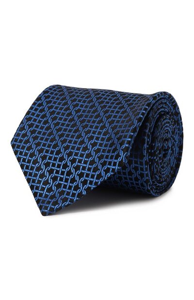 Широкий галстук из гладкого черного шелка оплетают узкие шнуры оттенка синий электрик. В лучах света жаккардовый рисунок буквально вспыхивает, усиливая контраст. Яркость не мешает узору выглядеть достаточно сдержанно, чтобы широкий аксессуар, созданный в технике seven fold, смог вписаться в строгий офисный образ.
