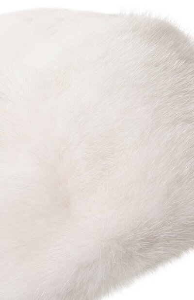 Для изготовления белой шапки с широкой объемной манжетой использовали мягкий легкий мех норки. Деталь для тульи предварительно ощипали и подстригли, придав сходство с плотным плюшем. Аксессуар из такого материала не потеряет внешний вид, форму и чистоту цвета под дождем и мокрым снегом.