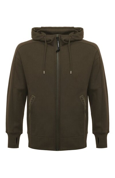Толстовка из плотного хлопкового футера цвета хаки отлично держит тепло, поэтому может стать хорошей альтернативой легкой куртке в прохладную погоду. Длинные рукава дополнены манжетами-митенками. На капюшоне — знаковые для марки пластиковые линзы. Два врезных кармана, как и сама модель, застегиваются молниями.