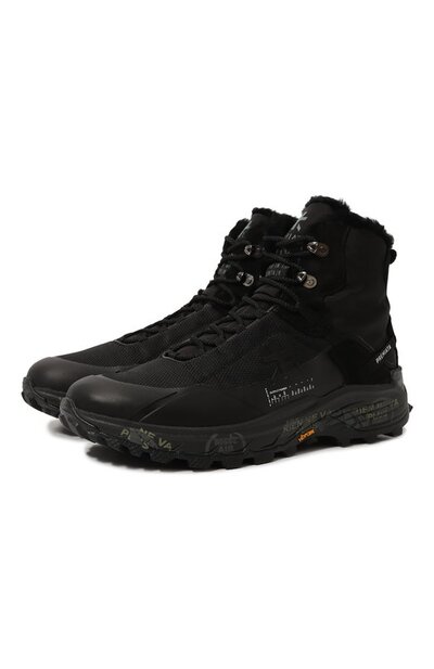 Черные кроссовки Saint Cross с высокой усиленной шнуровкой скомбинировали из плотного водоотталкивающего текстиля и гладкой кожи. Внутренняя отделка из густой овчины адаптирует модель к морозной погоде. Пару украсили знаковыми аппликациями в виде иероглифа, а на подошве разместили узнаваемые печати и штампы.