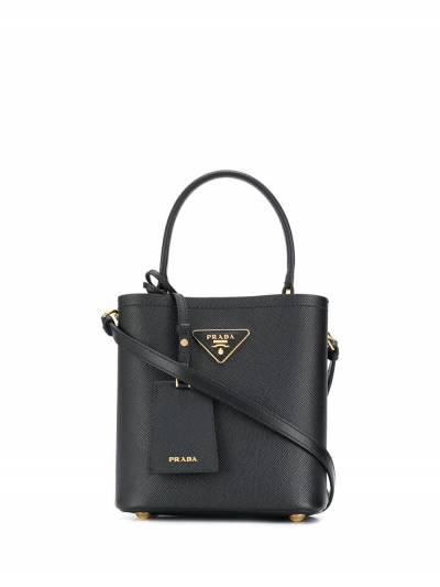 Conversational Mandarin, a solo backpacking trip and a Prada handbag - you have a pretty detailed bucket list. Start crossing some things off with this logo plaque bucket bag. Carpe diem in style. Featuring a detachable and adjustable shoulder strap, a round top handle, gold-tone hardware, a front logo plaque, an open-top design, interior compartments divided by a partition, purse feet and an internal gold-tone embossed logo.