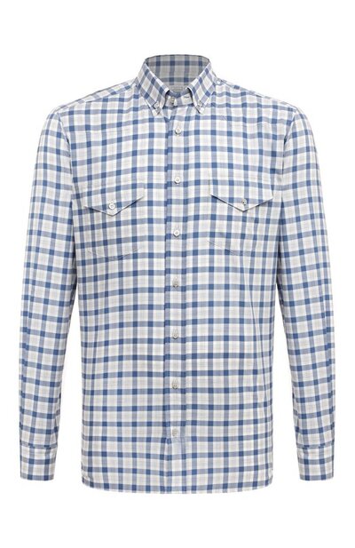 Для изготовления синей рубашки в клетку использовали тонкий хлопковый твил. Материал идеально пропускает воздух и почти не мнется, поэтому модель с длинными рукавами и воротником button down будет выглядеть опрятно в течение дня. В неформальном образе предлагаем сочетать изделие с шерстяными брюками, пальто и кроссовками.