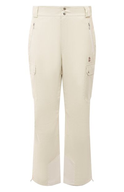 Дизайнеры марки, основанной Брунелло Кучинелли, адаптировали кремовые карго для капризной погоды. Для пошива модели использовали плотный нейлон с мембраной, который не продувается ветром и отталкивает влагу. Потайные манжеты защищают от попадания снега внутрь. Посадку на талии можно регулировать поясом с лентами-велкро.