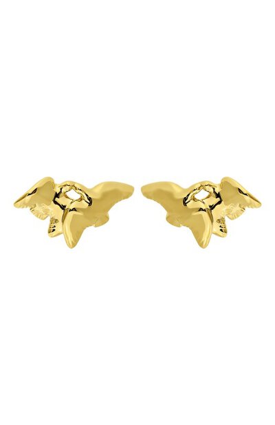 В этих серьги из позолоченной латуни, которые создал для марки парижский ювелир Хьюго Крейт, угадываются очертания двух голубей, будто перелетевших с флакона духов L'air du Temps. Аксессуар дополнили застежкой-пусетом.