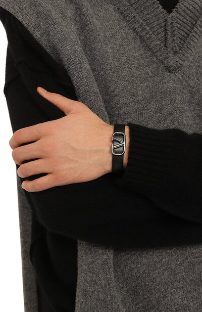 Широкий черный браслет добавит образу маскулинность. Для изготовления модели использовали плотную гладкую кожу, устойчивую к заломам и царапинам. На фоне матового материала контрастно выделяется крупная серебристая эмблема VLogo из полированного металла с сияющим родиевым покрытием, в тон которой выполнена квадратная пряжка, как на брючном ремне.