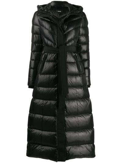 Black feather down Calinar maxi down coat from Mackage featuring a zip and press stud fastening, a hood, a belted waist, side slit pockets, long sleeves, ribbed cuffs, a long length and padded.