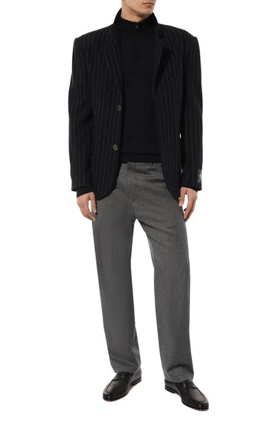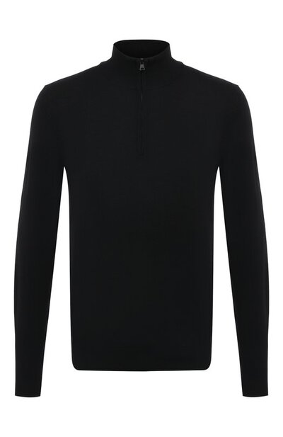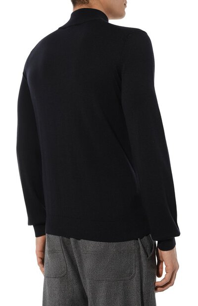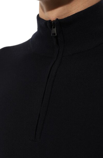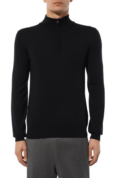 Темно-синий свитер с воротом, как у водолазки, и короткой молнией выполнили из приятной на ощупь шерсти. Несмотря на тонкость она хорошо сохраняет тепло, обеспечивая комфортную терморегуляцию. Сырье закупили у компаний, которые придерживаются принципа «пяти свобод» в сфере благополучия животных.