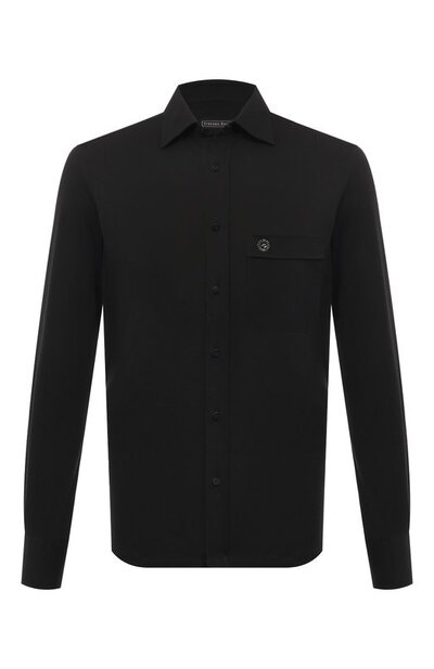 Черная рубашка с отложным воротником и длинными рукавами органично впишется образ total black с брюками и дерби. Для пошива модели использовали дышащее хлопковое джерси, которое обеспечивает комфортный микроклимат и хорошо тянется, сохраняя свободу движений. Накладной карман украсили миниатюрной деталью с фирменной головой орла, выполненной из оцинкованного палладия.