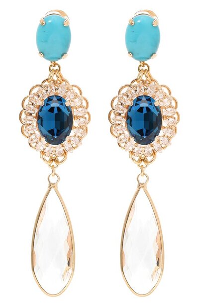Крупные серьги в исполнении Антона Хейниса выглядят максимально торжественно. Изысканными их делает двухъярусная подвеска с граненым каплевидным хрусталем и сверкающим кубическим цирконием двух цветов. Основание украсили овальным кабошоном из акрила, который напоминает бирюзу. Украшение с итальянской застежкой покрыли тонким слоем золота.