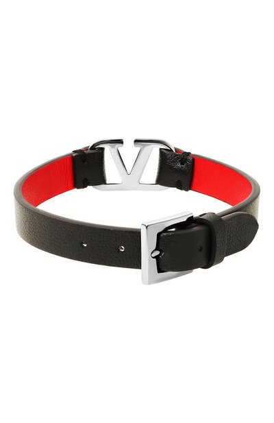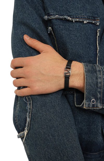 Черный браслет поможет создать деликатный акцент как в повседневном, так и нарядном комплекте. Для изготовления аксессуара, регулируемого миниатюрной пряжкой, использовали плотную прочную кожу, отшлифованную до глянцевого блеска. В центре украшения поместили фигурную эмблему VLogo из ювелирного сплава с серебристым покрытием.