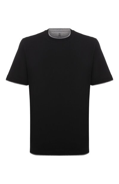 Для пошива черной футболки мастера марки, основанной Брунелло Кучинелли, использовали тонкое мягкое джерси. Материал произвели из ультрадлинных волокон хлопка премиальных сортов, поэтому изделие максимально приятно ощущается на коже. Короткие рукава, вырез и низ модели дополнили узкими серыми вставками.
